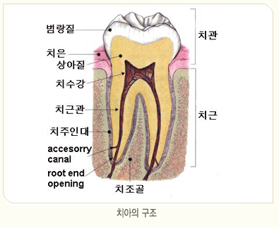 | 치수 | 치아 속 심 | 치아 속 깊은 곳 | 아프거나 피가 나는 곳 (신경, 혈관) |